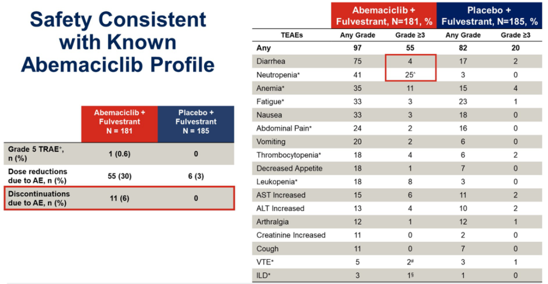 在主要的临床和基因组亚组(包括基线时有ESR1或PIK3CA突变的患者)中观察到一致的效应。阿贝西利组的ORR优于安慰剂组(在有可测量疾病的患者中,ORR分别为17%和7%)。根据BICR的PFS也有所改善,HR=0.55(95%CI:0.39~0.77)。OS仍不成熟(20.9%的事件发生率)。安全性与阿贝西利已知的特征一致。