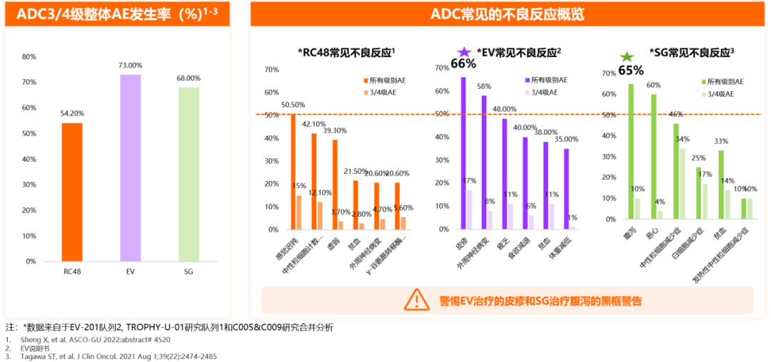目前已经获批用于尿路上皮癌的ADC当中,国外的2种药物(EV和SG)相关研究多入组非中国患者。在3~4级不良反应发生率方面,EV和SG分别有73%和68%严重不良事件发生。对于三种药物的常见不良反应,RC48、EV均可能出现外周神经方面的不良反应;而对于EV而言,皮肤相关不良反应发生率高于外周神经病变。SG的常见不良反应为消化道毒性,包括严重腹泻。(非头对头比较,入组患者有差异,谨慎解读数据)