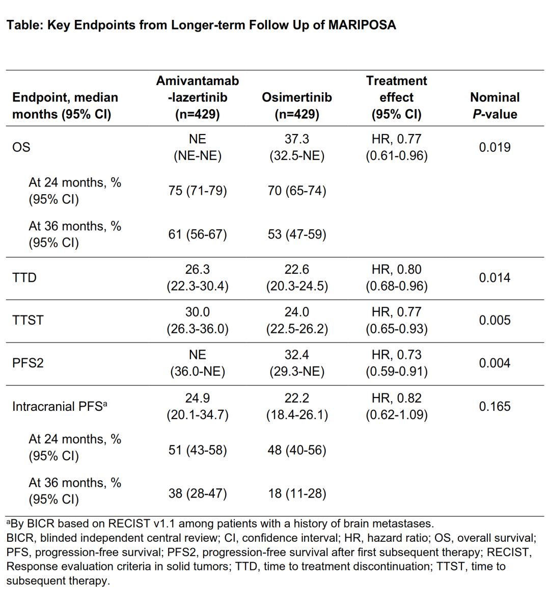 1.S.Gadgeel,et al.Amivantamab Plus Lazertinib vs Osimertinib in First-line EGFR-mutant Advanced NSCLC:Longer Follow-up of the MARIPOSA Study.2024 WCLC,OA02.03.