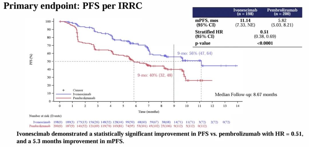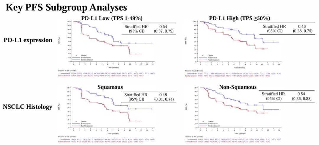 在8.67个月的中位随访期内,依沃西单抗治疗患者的中位PFS为11.14个月(95%CI:7.33-不可估计[NE]),而帕博利珠单抗治疗患者的中位PFS为5.82个月(95%CI:5.03-8.21)(分层HR=0.51;95%CI:0.38-0.69;P<0.0001)。依沃西单抗和帕博利珠单抗的9个月PFS率分别为56%(95%CI:47%-64%)和40%(95%CI:32%-48%)。“这是第一项随机III期研究证明与帕博利珠单抗相比,新药在晚期NSCLC中的疗效有显著改善,”该研究的主要作者、上海市东方医院周彩存教授在数据介绍中表示。
