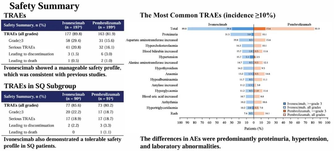 依沃西单抗的安全性与先前的研究一致,耐受性良好,包括鳞状NSCLC患者。不良反应(AE)发生率较高的主要是蛋白尿、高血压和实验室结果异常等。