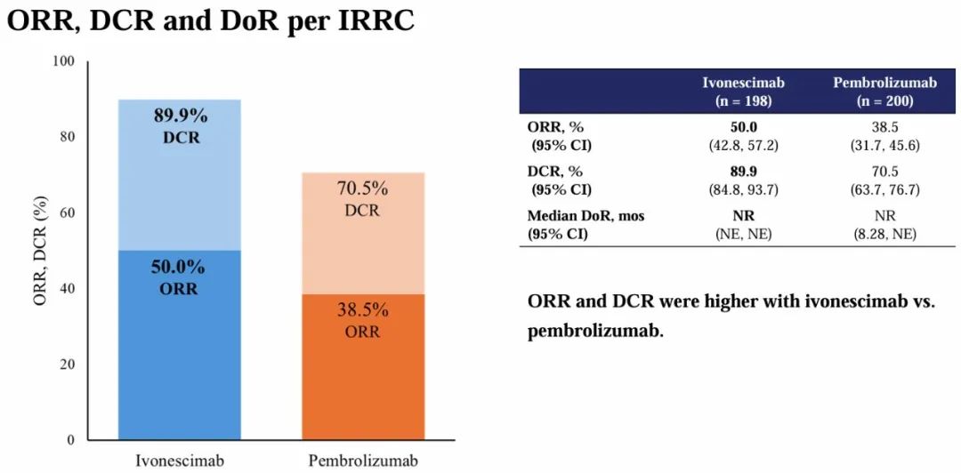 其他结果表明,依沃西单抗的ORR高于帕博利珠单抗,两组的ORR分别为50%(95%CI:42.8%-57.2%)和38.5%(95%CI:31.7%-45.6%),DCR分别为89.9%(95%CI:84.8%-93.7%)和70.5%(95%CI:63.7%-76.7%),中位DoR均未达到。
