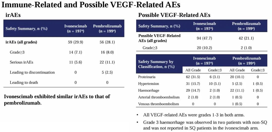 关于免疫相关不良反应(irAE),29.9%接受依沃西单抗治疗的患者发生irAE(≥3级,7.1%),但没有导致治疗停止或死亡。47.7%接受依沃西单抗治疗的患者发生可能的VEGF相关AE(≥3级,10.2%)。依沃西单抗组中2名非鳞状NSCLC患者发生3级出血。