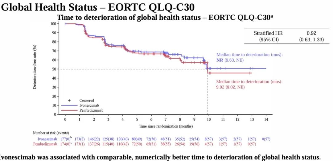 根据EORTC QLQ-C30,依沃西单抗组相比对照组的“整体健康状况恶化时间”似乎相当,甚至数值上更佳,分别为未达到中位值(95%CI:9.63-NE)和9.92个月(95%CI:8.02-NE)(分层HR=0.92;95%CI:0.63-1.33)。