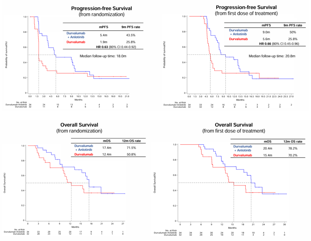 DURABLE结果显示,与单药维持治疗相比,度伐利尤单抗+安罗替尼维持治疗将PFS从中位1.9个月提高到5.4个月;如果从一线治疗开始,PFS从5.6个月延长到9个月。令人欣喜的是OS获益趋势也非常明显,中位OS从12.4个月延长到17.4个月,如果从一线治疗开始,中位OS从15.4个月延长到20.4个月,都提高了5个月。
