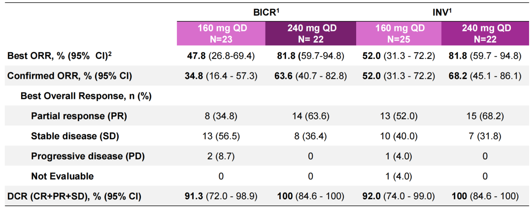 这次我们报告的数据显示,伏美替尼240mg qd剂量组患者的BICR确认的客观缓解率(cORR)达63.6%,疾病控制率达到了100%,这样的结果是非常令人兴奋的。实际上,伏美替尼160mg qd对患者也是有效的(cORR为34.8%),从大会报告的疗效瀑布图来看,两个剂量组患者的肿瘤缩小都是很明显的。