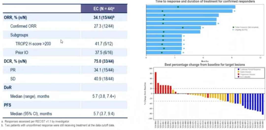 这次汇报的芦康沙妥珠单抗(SKB264/sac-TMT)单药治疗晚期子宫内膜癌和卵巢癌的Ⅱ期研究,主要针对铂类经治的晚期子宫内膜癌和卵巢癌,对患者予以芦康沙妥珠单抗(SKB264/sac-TMT)5 mg/kg Q2W直至进展、不耐受或脱落。每8周评估,并根据TROP2表水平评分进行亚组分析。