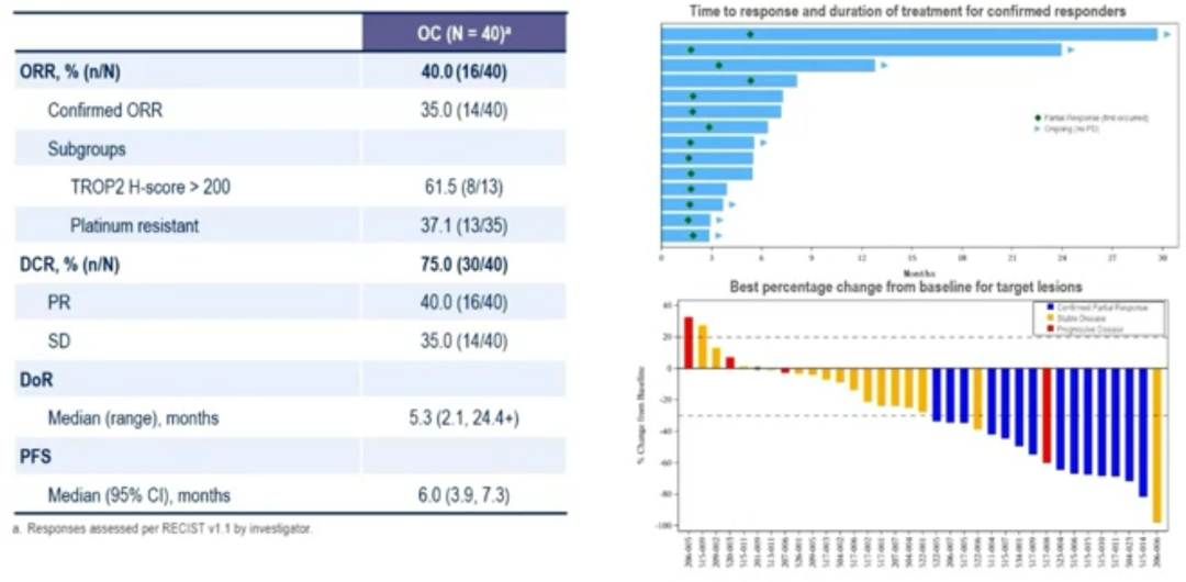 卵巢癌队列的结果同样令人振奋。我们共纳入了40例患者,中位随访时间长达28.2个月,且所有患者均接受过二线或以上治疗,其中87.5%的患者为铂类耐药,正如前面所提到的,铂类耐药是我们目前最为棘手的难题之一。在这种情况下,芦康沙妥珠单抗(SKB264/sac-TMT)单药治疗取得了40%的ORR和75%的DCR,中位PFS为6个月,这意味着患者有望逆转铂耐药的困境,恢复铂敏感状态,为后续治疗开辟了新途径。