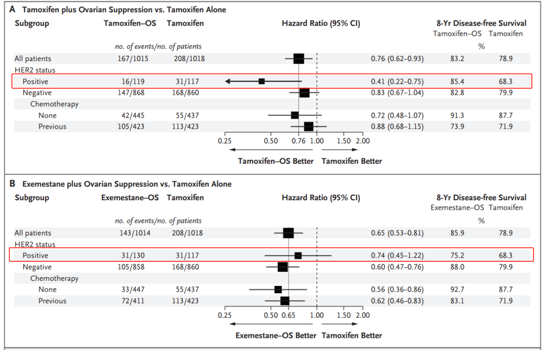 然而,在涉及6个大型临床试验(TEAM、ATAC、BIG 1–98、SOFT、TEXT、ALTTO)5390例(45%为绝经前)HR+/HER2+乳腺癌患者的荟萃分析中,仍无法得出TAM vs AI孰优孰劣的结论,也没有关于是否增加OFS而增加获益的分析[18]。因此,针对HR+/HER2+绝经期患者早期内分泌治疗的OFS仍需进一步探讨,尤其是优势人群的筛选。