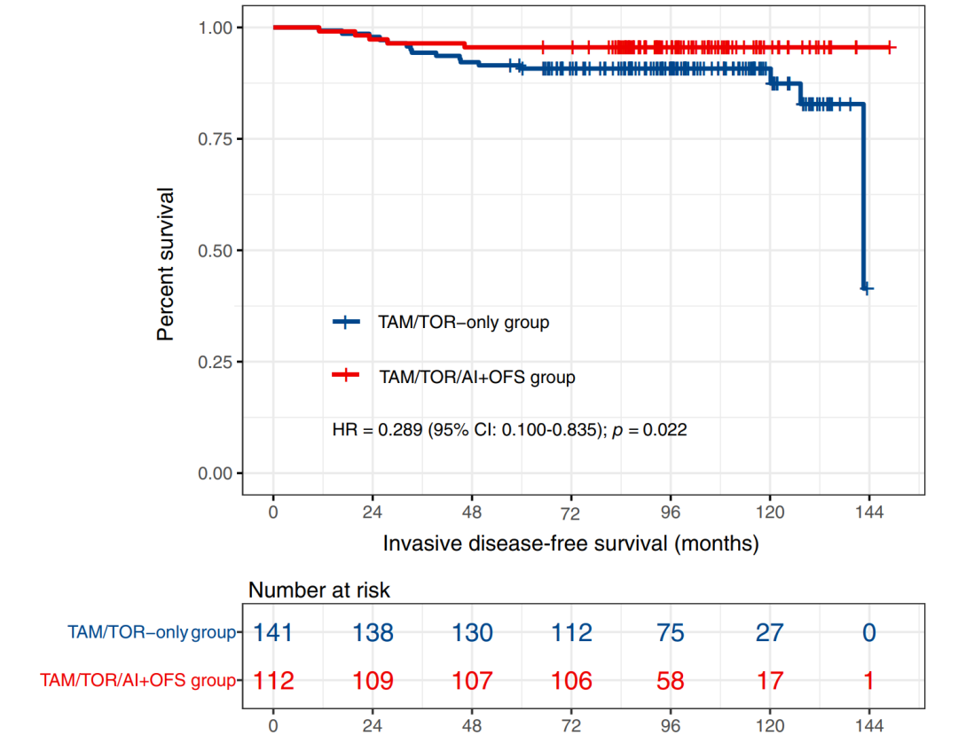 △中国真实世界研究HR+/HER2+绝经前乳腺癌患者是否联合OFS辅助治疗的IDFS曲线