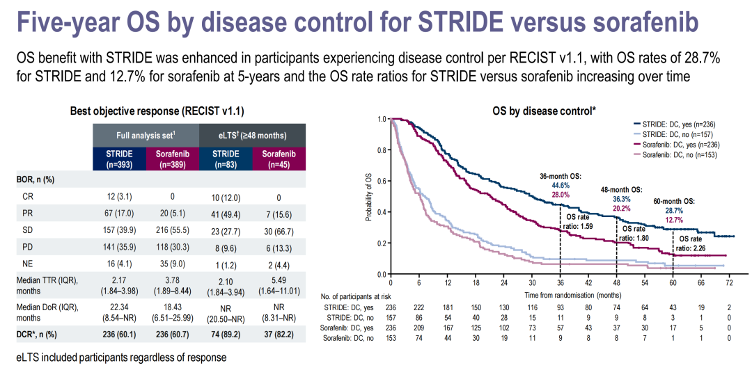 黄志勇教授:我认为这一结果极为鼓舞人心。19.6%的5年OS率无疑是一个令人瞩目的成绩。另外值得注意的是,对于达到疾病控制的患者群体,STRIDE方案相较于对照组索拉非尼的5年OS率达到了28.7%vs 12.7%,OS的K-M曲线分离趋势逐渐加大,展示了极为显著的长期疗效差异。