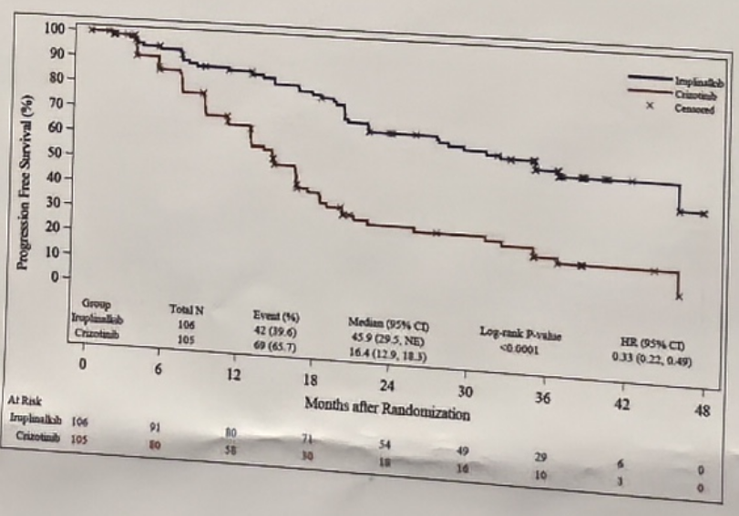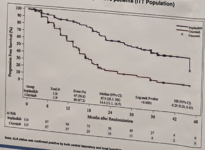 IRC评估的ALK阳性患者的中位PFS分别为45.90个月(28.32-NE)和14.55个月(11.07-16.53),HR(95%CI)为0.292(0.199-0.430)。
