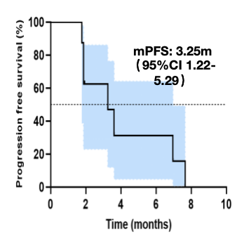 在队列2中,8例患者的DCR为62.5%(未观察到缓解)。mPFS为3.25个月(95%CI:1.22~5.29)。8周PFR为87.5%。在亚组分析中,少于四线接受索凡替尼治疗患者的PFS为3.61个月(95%CI:0.04~7.19)。两个队列的OS数据均未成熟。