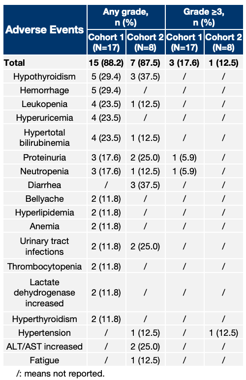 安全性方面,队列1和队列2分别有88.2%和87.5%的患者经历了≥1次治疗期间不良事件(TEAE)。队列1报告的≥3级TEAE包括蛋白尿(5.9%)和中性粒细胞减少(5.9%),队列2则为高血压(12.5%)。
