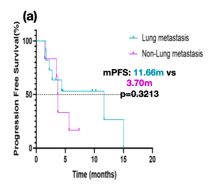 队列1中位PFS(mPFS)为4.37个月(95%CI:3.06~5.68),肺转移患者的mPFS较长(11.66 vs.3.70个月;P=0.3213)。在亚组分析中,9例LMS患者的mPFS为5.65个月,ORR为22.2%(2/9)。