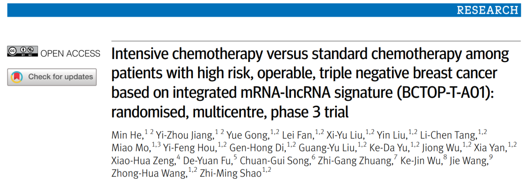 编者按:当地时间10月23日,素有国际“四大医学期刊”之称的《英国医学杂志》(The BMJ)发表了复旦大学附属肿瘤医院邵志敏教授等牵头成立的乳腺肿瘤精准治疗协作组自主发起全国多中心随机对照III期BCTOP-T-A01研究成果。该研究在国际上首次使用多基因分类策略对早期三阴性乳腺癌(TNBC)进行风险分层,并通过前瞻性研究验证了高危患者采用含GP的强化辅助治疗能够进一步提高无病生存(DFS)率。《肿瘤瞭望》特邀该研究PI之一、复旦大学附属肿瘤医院王中华教授介绍和解读该研究如下。