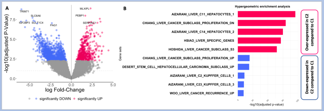图2.A)火山图显示了C1和C2之间差异表达的基因(DEGs)。对数倍数变化代表了两个簇之间基因表达变化的幅度。差异表达基因的定义是p值阈值≤0.05且对数倍数变化>|1|。以灰色表示的基因没有显示出显著的下调或上调。以覆盆子红色表示的基因在C2中相对于C1显著上调(反之,在C1中相对于C2显著下调)。以蓝色表示的基因在C2中相对于C1显著下调(反之,在C1中相对于C2显著上调)。B)在C2相对于C1的肝肿瘤微环境中,前5个细胞基因集上调(覆盆子红色)和下调(蓝色)的情况。