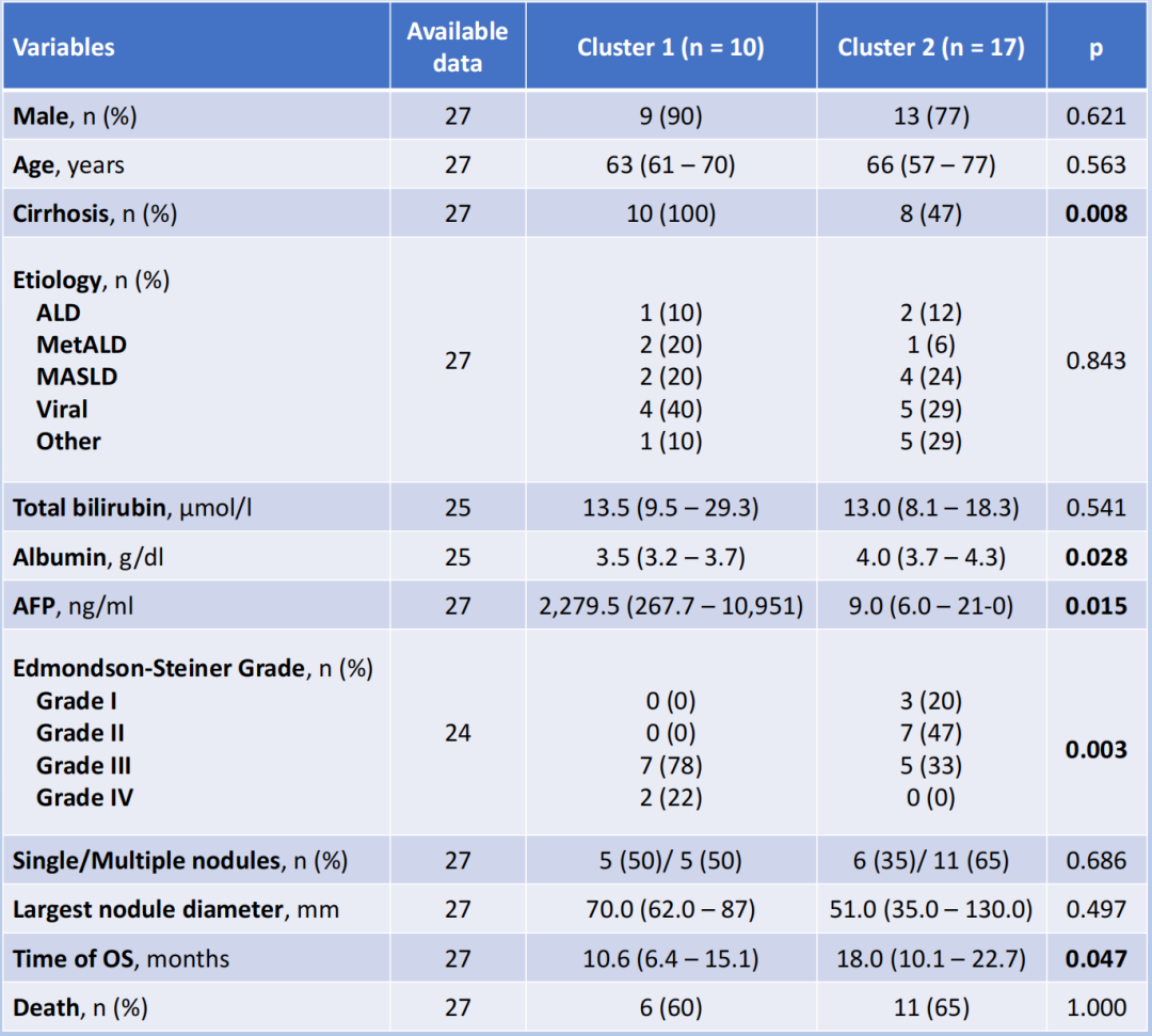 根据RNA测序分析,经无监督层次聚类分析识别出两组患者,10名C1组(Cluster 1),17名C2组(Cluster 2),其中大多数有反应者在C2组,两组间存在不同的基因表达(图1)。这两组患者在肝硬化(P=0.008)、白蛋白(P=0.028)和AFP水平(P=0.015)、组织学分化(P=0.003)和HCC亚型(P=0.03)以及OS时间(C1组:10.6个月;C2组:18.0个月;P=0.047)方面存在差异(表1)。