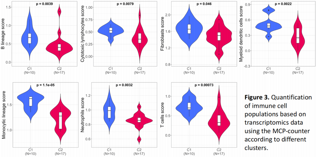 图3.根据不同簇,使用MCP计数器基于转录组数据对免疫细胞群进行定量分析