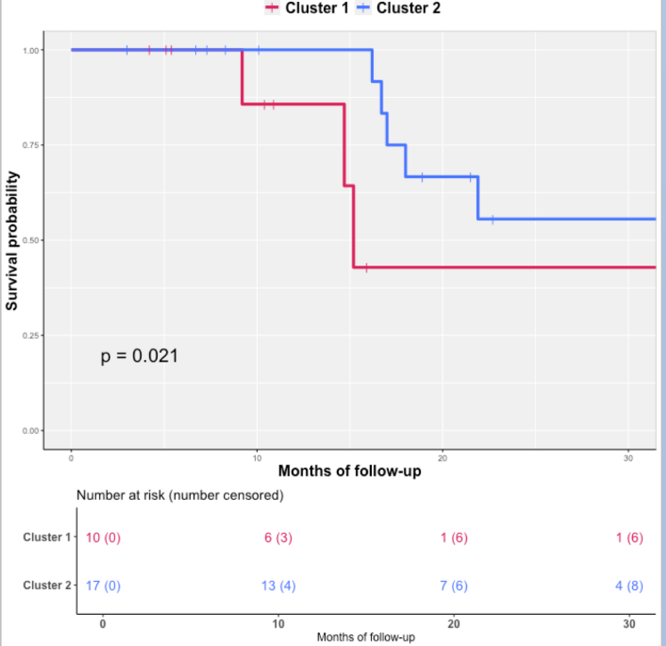 通过微环境细胞群计数法,发现C1与C2相比有丰富的免疫浸润(单核细胞、髓样树突状细胞、细胞毒性淋巴细胞、中性粒细胞、成纤维细胞、T细胞和B细胞)(图3)。Cox单因素分析显示,仅在3个月时无反应的患者死亡风险更高(HR 0.16,95%CI 0.04-0.54,P=0.004)。Kaplan-Meier曲线证实,C1患者的存活率显著低于C2患者(P=0.021)(图4)。