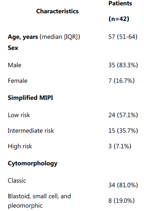 从2020年10月至2023年11月,共完成了42名患者的招募。中位年龄为57岁(IQR,51-64岁)。III-IV期患者占92.8%,其中42.8%的患者简化MIPI评分为中危或高危。34名患者(81.0%)为经典型MCL。ZR治疗的中位周期数为4(范围,2-6)。截至2024年1月,在37/42名完成治疗后PET评估的患者中,ZR方案的最佳完全缓解(CR)率为91.9%(34/37),其中94.1%(32/34)在2-4个周期后获得CR。骨髓MRD阴性CR率为92.0%(23/25)。其他5/42名患者仍在接受ZR治疗,随后将进行PET评估。在27名完成化疗且可评估疗效的患者中,仅有一名患者出现疾病进展。中位随访时间为11.6个月,1年PFS率和OS率分别为90.1%和96.7%。两名患者分别因淋巴瘤(n=1)和COVID-19(n=1)死亡。ZR方案中的3-4级不良反应包括中性粒细胞减少(n=3)、疲劳(n=2)和转氨酶升高(n=1)。化疗期间,75.8%的患者观察到3-4级血小板减少症。