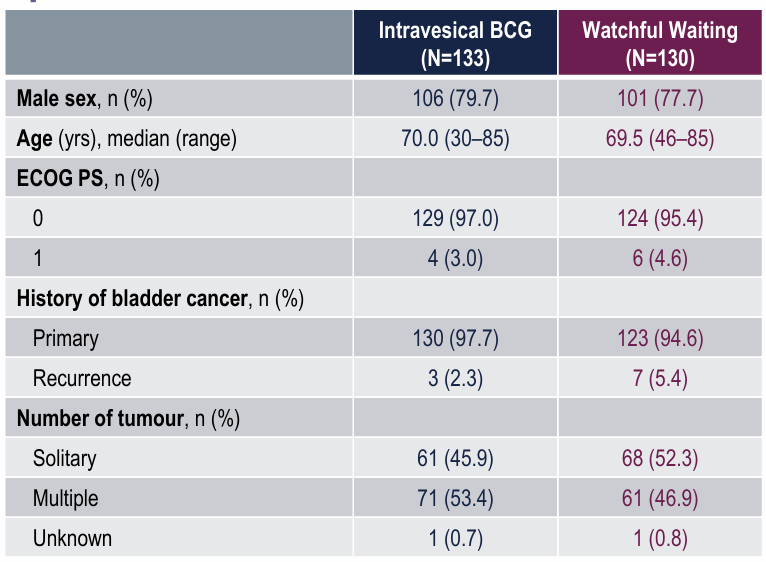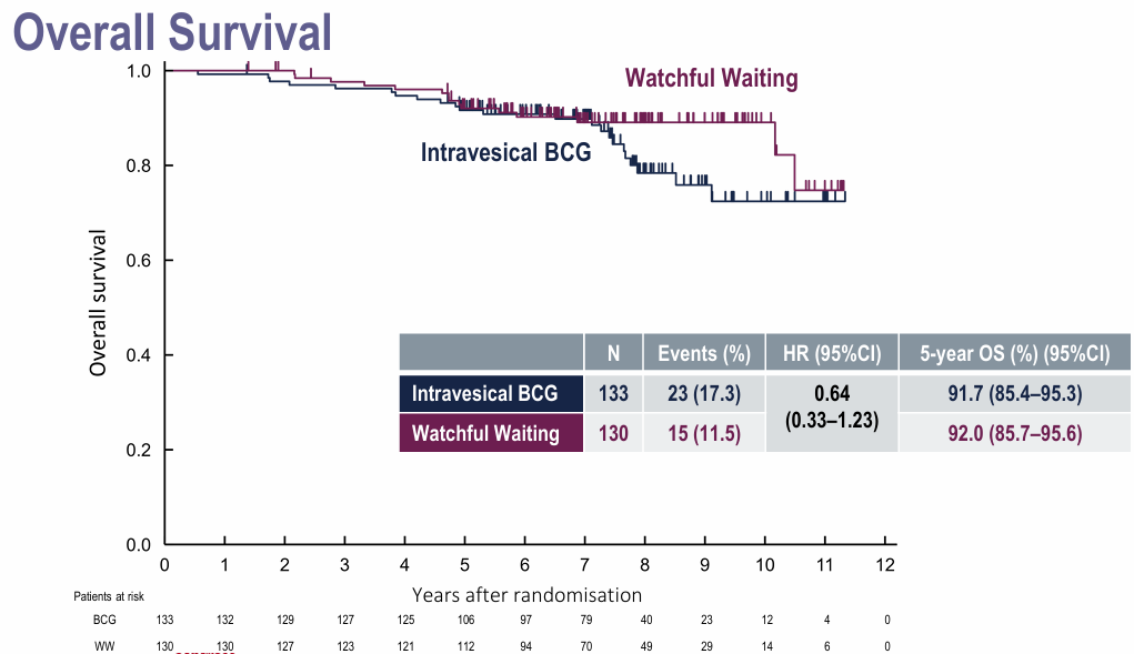 研究共分析了263名患者,随机分组接受卡介苗治疗(133名)或观察等待治疗(130名);组间患者特征平衡。在数据截止时,中位随访时间为7.02年。