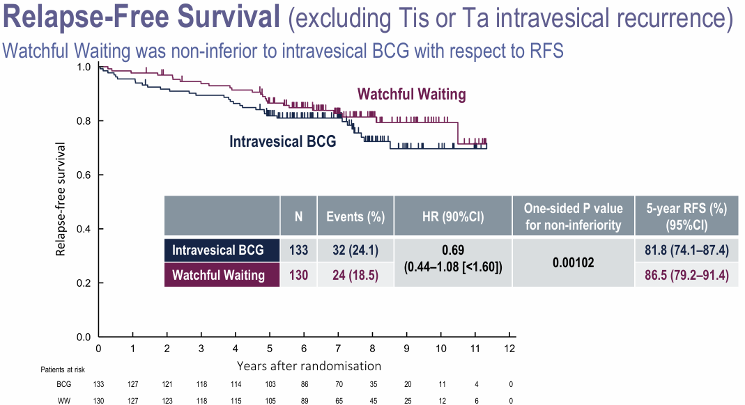 对于初次经尿道肿瘤切除术时为HGT1且二次经尿道肿瘤切除术时为pT0的膀胱癌患者,观察等待在RFS方面不劣于膀胱内卡介苗治疗(不包括Tis和Ta膀胱内复发)。观察等待的安全性优于卡介苗治疗。这些结果支持观察等待作为二次经尿道肿瘤切除术时为无残留肿瘤的HGT1患者的新标准治疗策略。