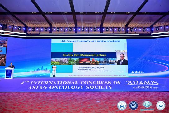 Kazuhiro Yoshida教授以“艺术、科学、人文:作为外科肿瘤学家的视角”为主题,发表了其获奖主题演讲。他结合自己在AOS的丰富经历,从微创手术、创立“新型护理典范”、围手术期管理以及精准肿瘤手术的前沿进展等多个方面,深刻阐述了外科肿瘤学家在临床实践中如何将艺术的美感、科学的严谨与人文的关怀完美融合。此番演讲不仅是对Jin-Pok Kim教授杰出成就的崇高致敬,更是对肿瘤防治事业未来发展的深切期盼与美好愿景。