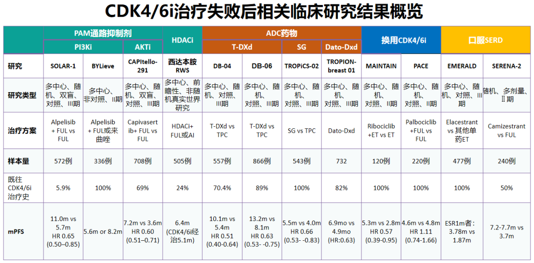目前,CDK4/6i经治患者已积累了一定的循证医学证据,可选的治疗策略包括PAM通路抑制剂、HDACi、ADC、换用CDK4/6i以及新型口服SERD等。ABCC指南的更新调整,主要基于不同的证据质量(见下表,非头对头比较),以及国内的药物可及性。