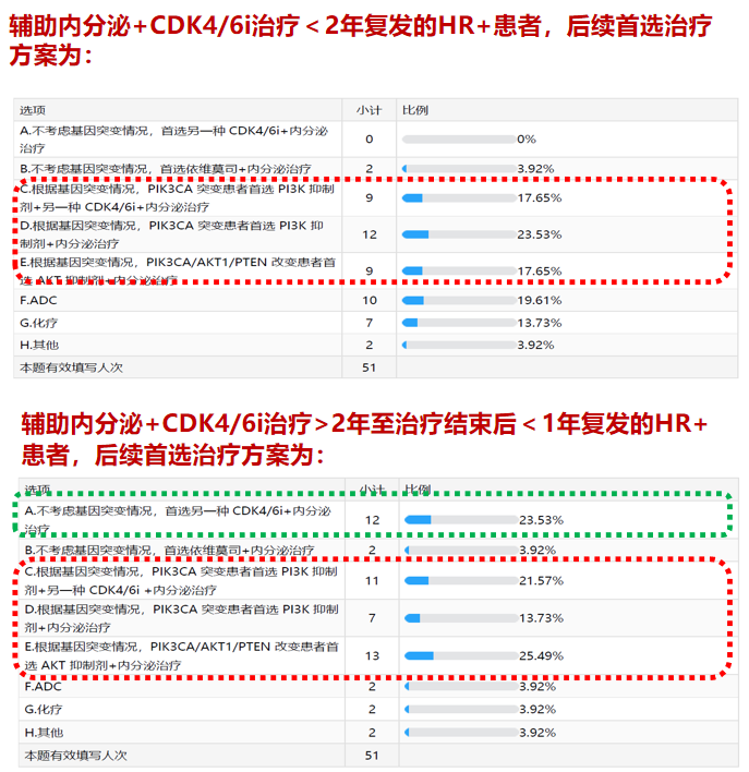 ADC已经成为HR+/HER2-晚期乳腺癌患者的重要治疗选择,但有关ADC药物最佳给药顺序的数据较少。基于临床试验的入组情况,T-DXd早于戈沙妥珠单抗使用可能是一个合理的选择。DB-06研究入组的是未经化疗的HER2低表达或超低表达晚期患者,而TROPiCS-02研究入组的是至少紫杉醇及CDK4/6抑制剂治疗失败的晚期患者。ABC7的43位专家投票中,同样有41位支持当前这一治疗顺序。此外,新版ABCC指南的中国专家投票中,还根据辅助内分泌+CDK4/6i的进展情况进行分层讨论,有超过一半的专家支持根据PAM通路变异选择靶向治疗。