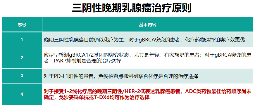 对于接受1-2线化疗后的晚期HER2低表达TNBC,ADC类药物最佳给药顺序尚未确定,戈沙妥珠单抗或T-DXd均可作为治疗选择,2024年ABCC专家投票中二者的选择比例相似(分别有45.1%和52.94%选择T-DXd和SG)。