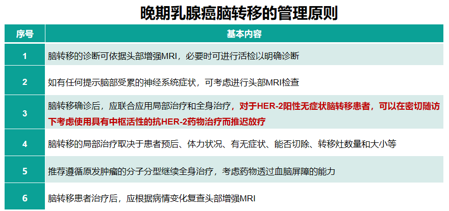 脑转移确诊后,应联合应用局部治疗和全身治疗;但新版ABCC指南强调,对于HER-2阳性无症状脑转移患者,可以在密切随访下考虑使用具有中枢活性的抗HER-2药物治疗而推迟放疗。