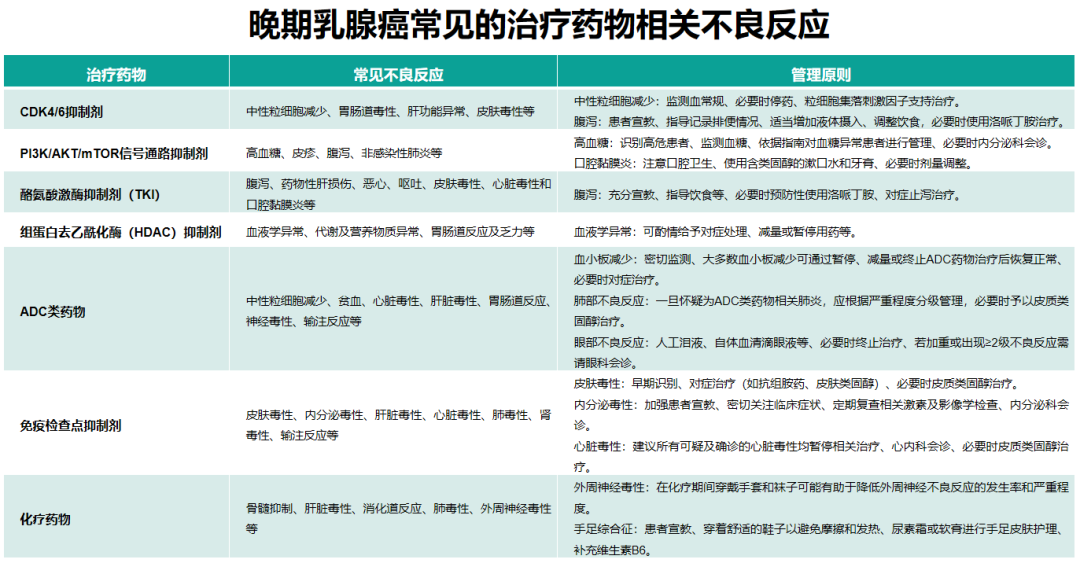 随着治疗药物的丰富,尤其是最新涌现的各类PAM通路抑制剂、小分子TKI、ADC以及ICI等新型药物,临床医生需掌握不同药物的不良事件谱。新版ABCC指南为此新增了不良反应管理的新章节。