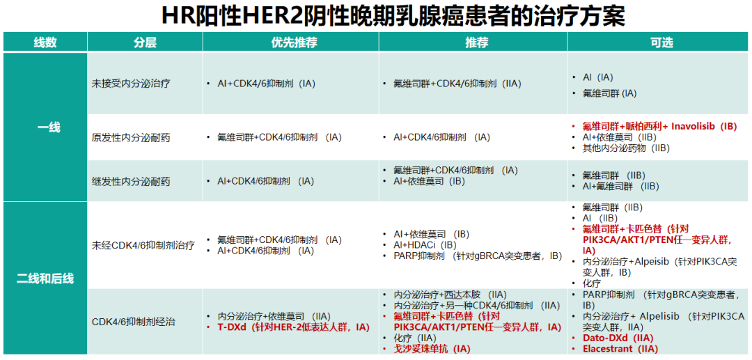 二线及后线治疗的更新更为丰富,对于CDK4/6i经治患者,基于DB-04、DB-06研究优先推荐携带HER2低表达患者选择T-DXd治疗;基于CAPItello-291研究推荐氟维司群+卡匹色替(针对携带PIK3CA/AKT2/PTEN任意突变的患者),基于TROPiCS-02研究推荐戈沙妥珠单抗;此外,基于TROPION-breast 01、EMERALD等研究,Dato-DXd、Elacestrant(针对ESR1突变患者)也是可选方案。