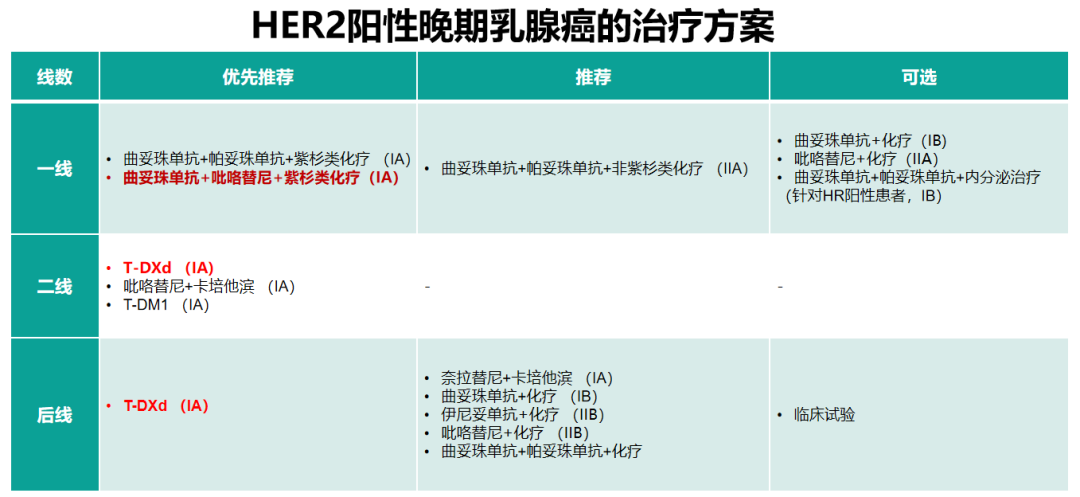 基于PHILA研究,一线治疗新增吡咯替尼+曲妥珠单抗+紫杉类(PyTH)化疗方案;二线及后线治疗随着T-DXd国内可及性改善,调整为IA类优先推荐方案。