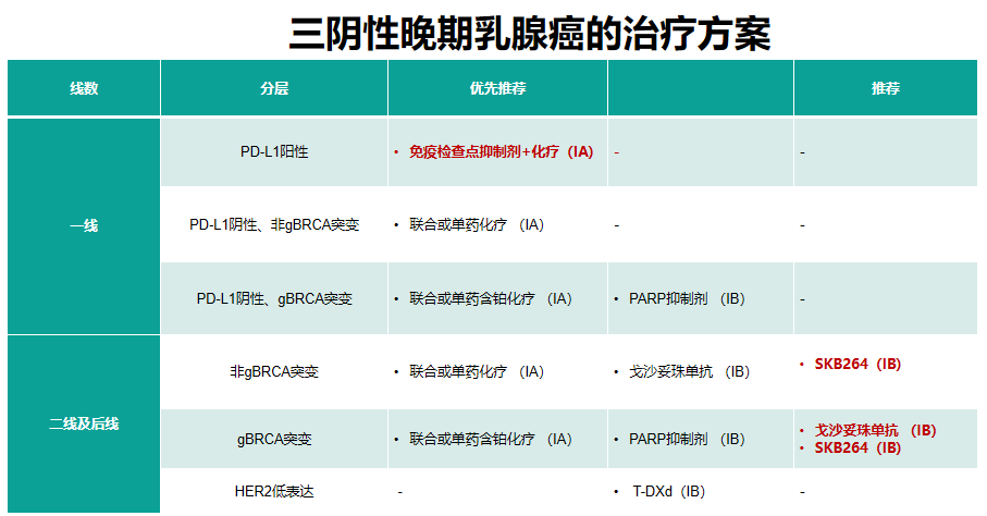 在一线治疗中,基于KEYNOTE-355、TORCHLIGHT等研究,新版ABCC指南推荐PD-L1阳性患者接受免疫检查点抑制剂(ICI)联合化疗;在二线及后线治疗中,基于OptiTROP-Breast01、ASCENT研究新增Trop-2 ADC药物SKB264、戈沙妥珠单抗的推荐。