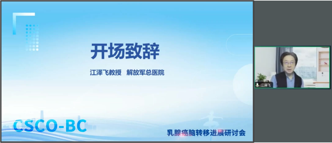 2024年11月19日晚19:00,全国各地乳腺癌诊断、治疗相关专家齐聚云端,“CSCO BC乳腺癌脑转移进展研讨会”正式开始。大会主席、CSCO候任理事长、解放军总医院江泽飞教授致开场辞,并提出CSCO BC将与CSCO神经系统肿瘤专家委员会携手共进,集合影像、诊断、放疗、内科等多学科力量,共同成就新版的《CSCO乳腺癌脑转移临床诊疗专家共识》。