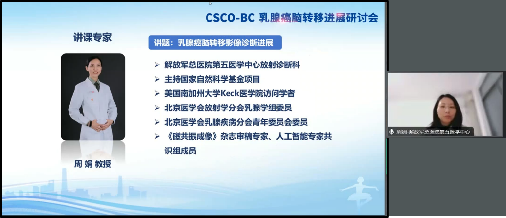 江泽飞教授的引导下,解放军总医院第五医学中放射诊断科周娟教授从筛查、诊断、导航、监测等方面阐述了影像检查之于乳腺癌的重要作用,并分享了乳腺癌脑转移影像诊断进展及临床实践注意事项。