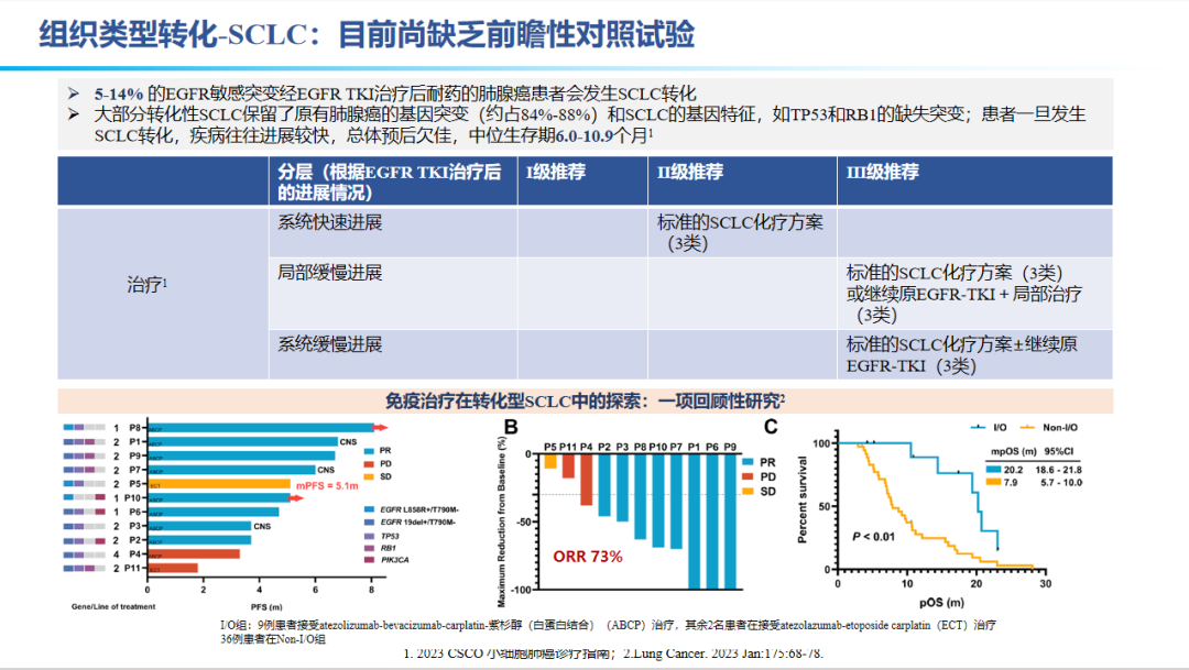 5-14%的EGFR敏感突变经EGFR TKI治疗后耐药的肺腺癌患者会发生SCLC转化,大部分转化性SCLC保留了原有肺腺癌的基因突变(约占84%-88%)和SCLC的基因特征,如TP53和RB1的缺失突变;患者一旦发生SCLC转化,疾病往往进展较快,总体预后欠佳,中位生存期6.0-10.9个月。对于该类患者的治疗目前尚缺乏前瞻性对照试验。