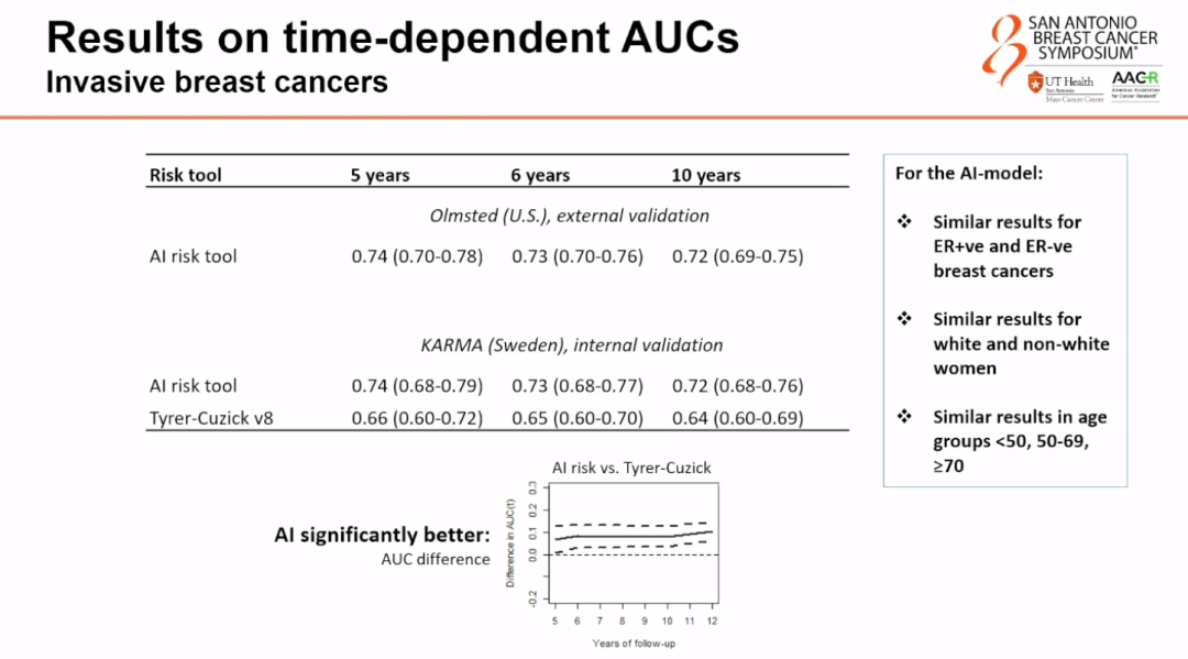 我们对年龄在30至90岁之间的女性进行了一项双站点病例队列研究,该研究基于人群筛查,包括美国明尼苏达州奥尔姆斯特德县的两个筛查点以及2009年至2017年间招募女性的KARMA队列。中位随访时间为10年。我们在一个独立的瑞典人群中开发了图像衍生的AI风险模型,并报告了在奥尔姆斯特德/KARMA研究中的验证结果。研究入组时计算了绝对10年风险。估计了时间依赖的受试者工作特征曲线下面积(AUCt)和预期事件与观察事件之比(E/O)。在KARMA中,使用临床指南与临床Tyrer-Cuzick v8模型进行了比较。对所有乳腺癌的风险进行了分析,并仅限于浸润性癌症。