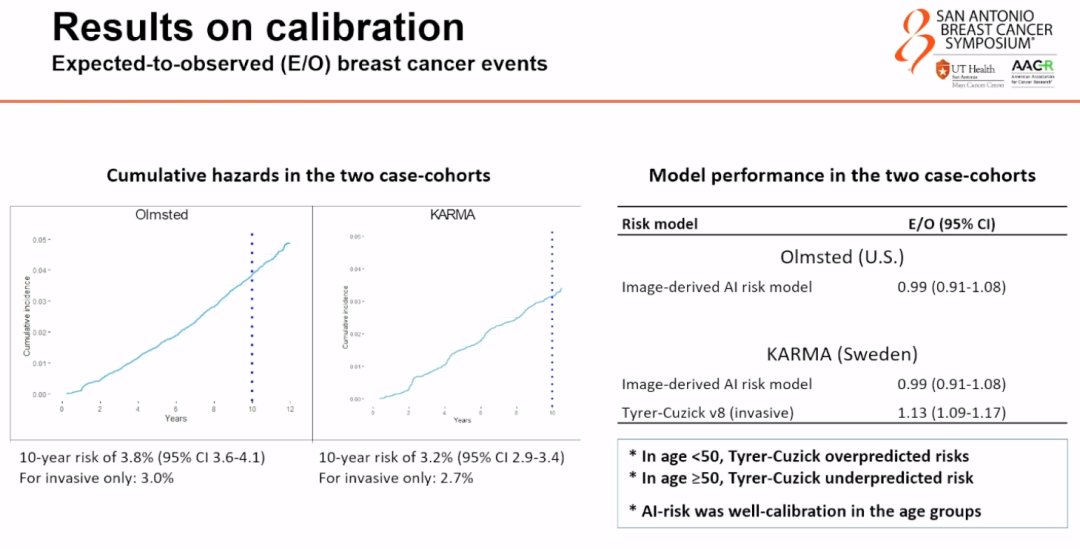 在两个病例队列中,10年图像衍生的AI风险模型显示出良好的鉴别能力和校准度,并且在KARMA中显示出比临床Tyrer-Cuzick v8风险模型更高的鉴别能力。图像衍生的AI风险模型具有临床应用的潜力,可用于一级预防,并针对高达三分之一的乳腺癌。
