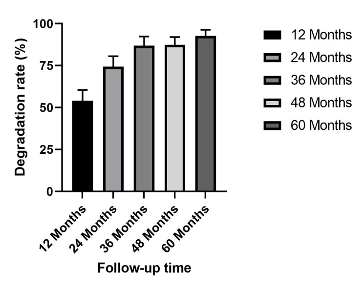 术后结果显示,植入物在术后的不同时间均能够维持自然且与对侧对称的乳腺外形。所有患者的乳头和乳晕区域均未出现皮瓣坏死或缺血情况;无患者报告功能性肢体功能障碍。术后1个月,12位患者有肿胀、疼痛或异物感,三个月后症状消失。术后1年组织学分析显示,支架内部及周围存在纤维结缔组织、成纤维细胞和血管。伴随着支架内的自体组织再生,3D打印支架在体内逐渐降解,平均降解率在12个月时为54.07%,24个月时为74.48%,36个月时为86.94%,48个月时为87.36%,60个月时为92.76%。