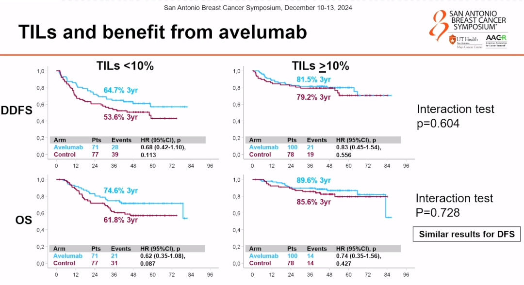 另一个重要的生物标志物是肿瘤浸润淋巴细胞(TILs)的比例。研究发现,在新辅助化疗后的标本中,如果TILs的比例小于10%,阿维鲁单抗的获益幅度会明显更大一些,但这类患者的预后相对更差。而如果TILs≥10%,患者的三年DFS较好,但此时阿维鲁单抗的获益并不明显。这表明,TILs比例也可以作为预测阿维鲁单抗疗效的一个重要因素。