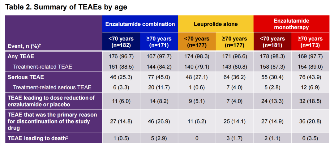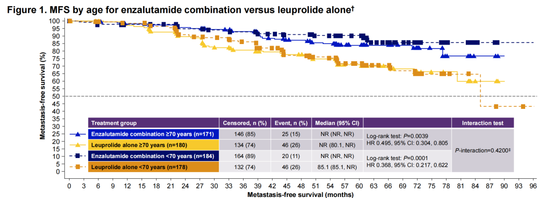 EMBARK研究对BCR治疗模式的探索很有借鉴意义,既往报道对于治疗36周达到PSA小于0.2ng/ml的患者,即可以停止治疗,这种模式不仅没有减少疗效获益,而且可以改善患者生活质量。此次ESMO报道了不同年龄人群的事后分析[7]显示,该治疗方案对老年人也非常“友好”。首先对于≥70岁的患者(HR 0.495),与<70岁的患者(HR 0.368),恩扎卢胺联合治疗均可相较于ADT改善患者MFS。当然,≥70岁老年患者的严重不良事件要高于<70岁患者(45.0%vs 25.3%)。对于不耐受联合治疗的老年患者,可以考虑接受恩扎卢胺单药治疗,而这两个年龄人群接受单药治疗(≥70岁:HR 0.611;<70岁:HR 0.671)同样均有MFS改善。