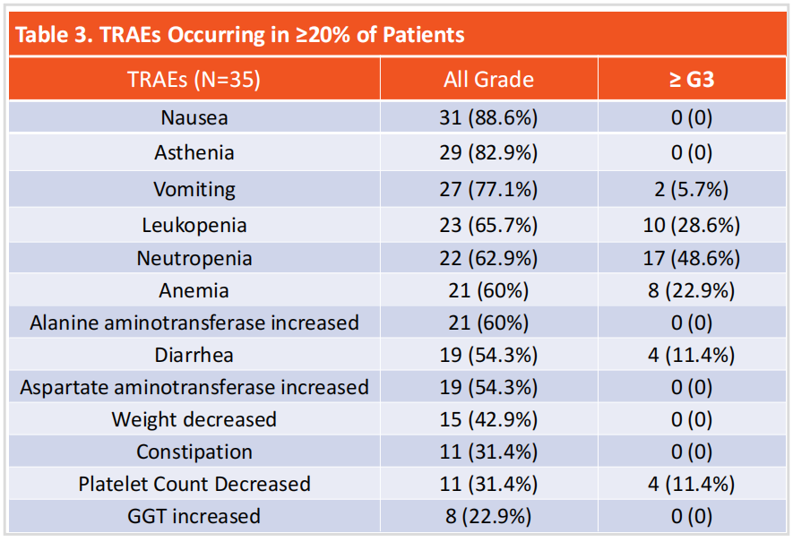 研究达到了第一阶段的主要终点,ORR达74.3%(26/35),包括26例部分缓解(PR)和9例疾病稳定(SD)。34例手术患者中无患者达到病理完全缓解(pCR)。所有35例患者都报告了治疗相关不良事件(TRAEs),≥3级治疗相关不良事件(TRAEs)的发生率为65.7%(23/35),最常见的≥3级TRAEs包括中性粒细胞减少(48.6%,17/35)、白细胞减少(28.6%,10/35)、贫血(22.9%,8/35)、腹泻和血小板计数减少(各11.4%,4/35)。对13例患者进行了以G-CSF为主的支持治疗后,未发生≥3级的中性粒细胞减少AE,无间质性肺病(ILD)及治疗相关死亡报道。