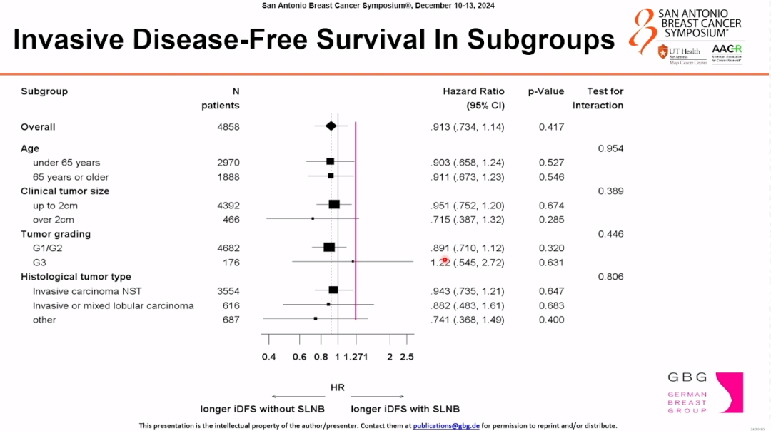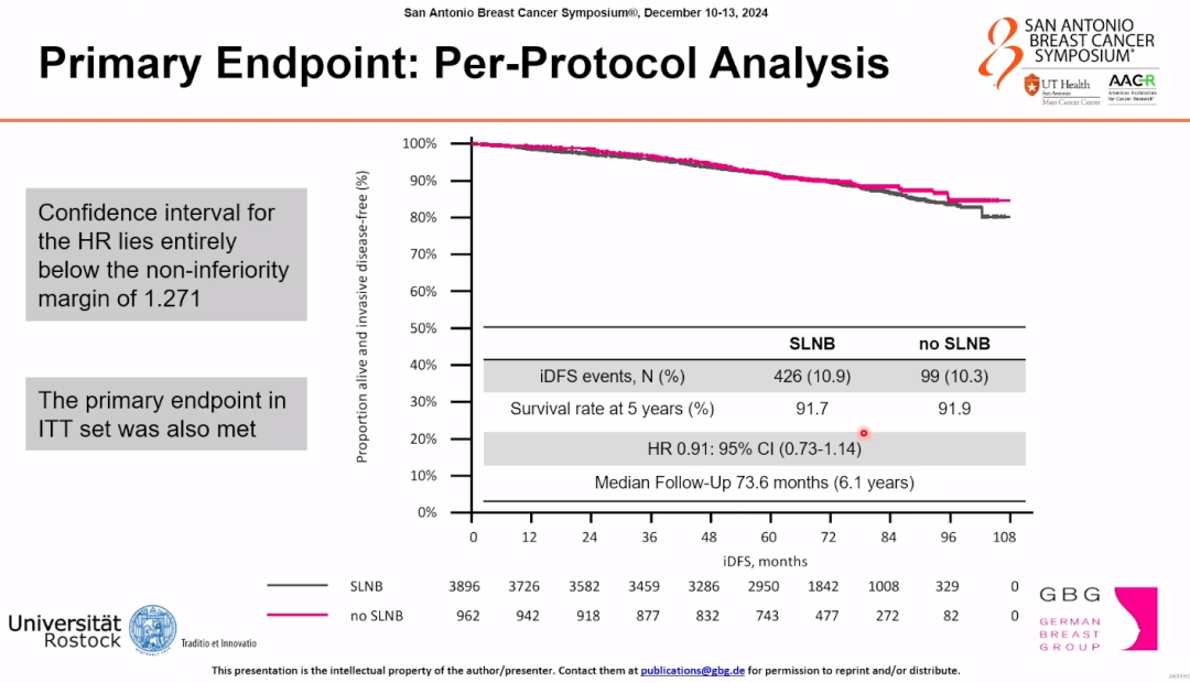 对于这些相对低危的患者,即刚才提到的研究中,SLNB组的5年IDFS为91.7%,而非SLNB组也达到了91.9%。这达到了当时研究设计的初衷,即对于这类低危患者,豁免前哨淋巴结活检的效果是非劣于进行前哨淋巴结活检的。这对于外科医生来说,确实让我们在临床实践中有了很多新的体会。因为现在乳腺癌的诊治过程中,早期病例越来越多,HR+/HER2-的患者也非常多。