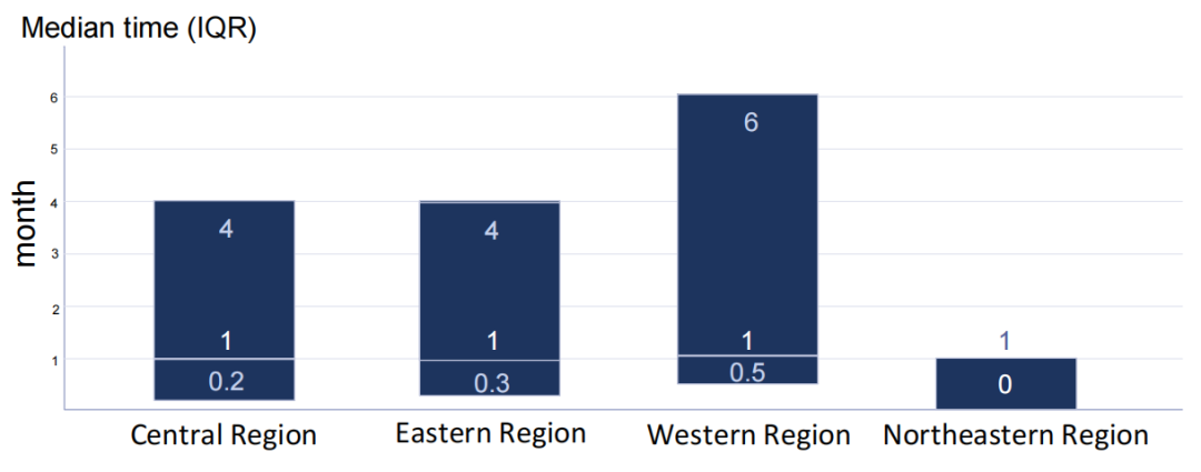 △中国不同地区县域乳腺癌患者就诊延迟时间(左至右:中部、东部、西部、东北地区)