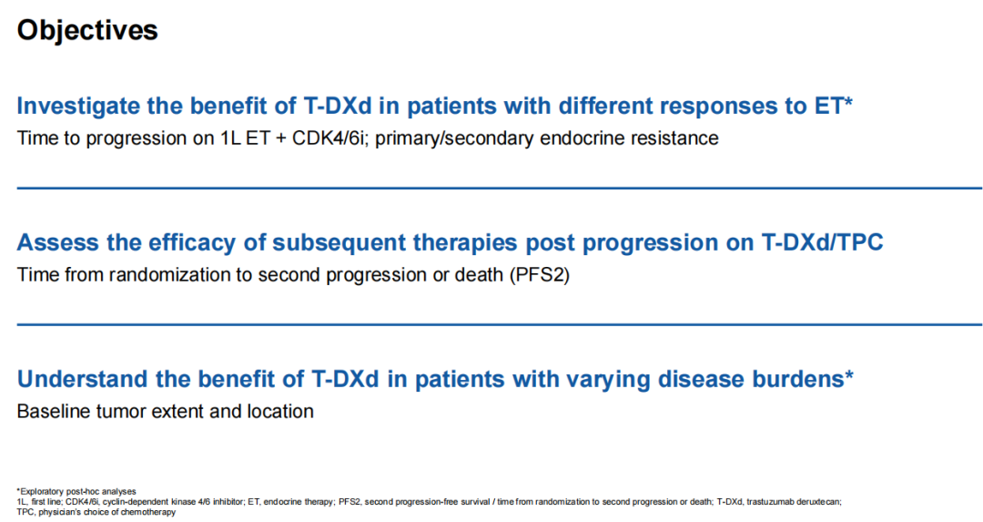 患者按1∶1的比例随机分配至T-DXd组(5.4 mg/kg,每3周静脉给药1次)或TPC组(59.8%为卡培他滨;24.4%为白蛋白结合型紫杉醇;15.8%为紫杉醇)。患者既往接受过≥2线针对mBC的内分泌治疗(ET),如果PD发生在辅助内分泌治疗24个月内,或者PD发生在一线(1L)ET+CDK4/6抑制剂(CDK4/6i)治疗6个月内(后者被认为是快速进展),则接受过一线内分泌治疗。亚组分析包括一线ET+CDK4/6i治疗至进展的时间(TTP),以及根据ESO-ESMO的晚期乳腺癌国际共识指南第五版(ABC 5)区分原发性与继发性内分泌耐药。结局指标包括ITT人群中的PFS、经盲态独立中心评审确认的客观缓解率(ORR)、持续缓解时间(DOR)以及安全性。