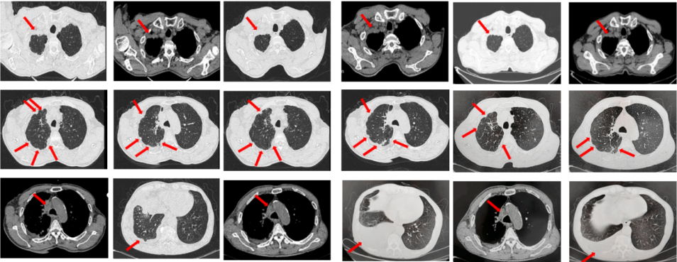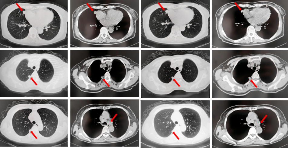 图1:由左至右分别展示基线(A.)及一线治疗后改变(B.和C.)。红色箭头指示病灶位置,由上至下分别为右肺肿物、右侧胸膜转移病灶及胸腔积液、左侧胸膜转移病灶、多发纵隔淋巴结肿大。