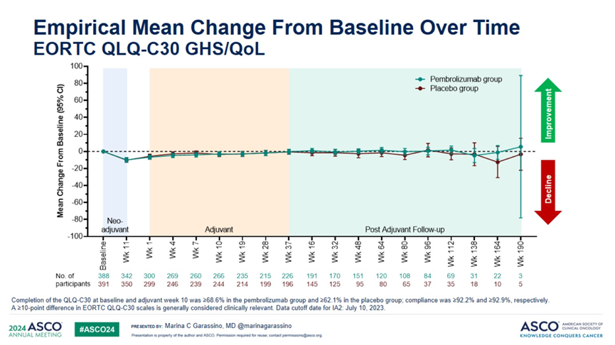 既往肺癌手术联合化疗的围术期治疗模式下,患者往往需要面临明显的药物不良反应、潜在并发症以及生存质量的明显下降。KEYNOTE-671研究也进行了相关研究,并在2024年ASCO会议上披露,围术期应用帕博利珠单抗未降低患者健康相关生活质量(HRQoL)(图2),且EFS与前期数据保持一致,有力证实NSCLC的围术期免疫治疗中的长生存获益,不仅不以健康状况和生活质量为代价,反而呈现出更少的不适症状与更高的安全系数。